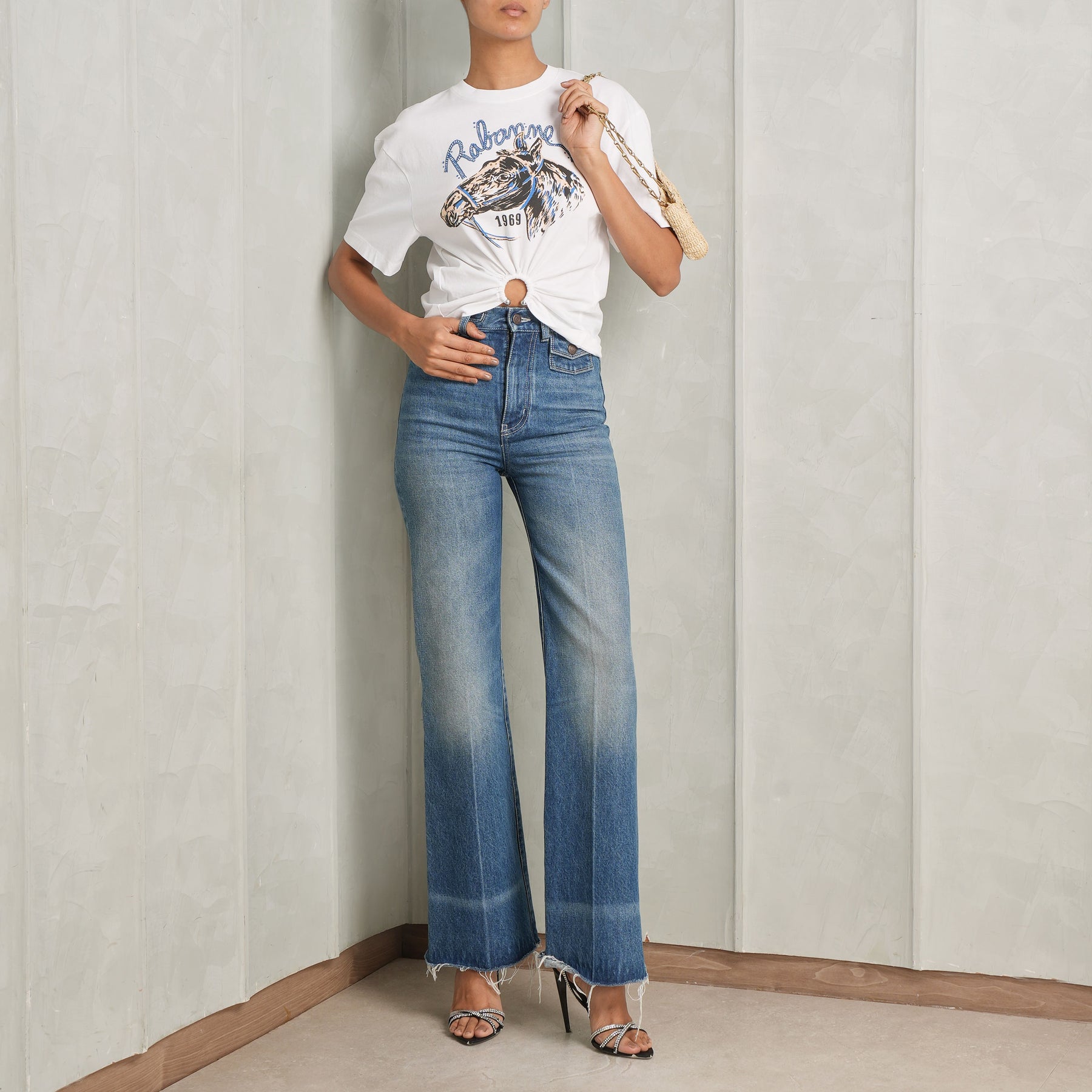 Meet Rabanne's contemporary icon - the Signature Logo Tee. This short-sleeved white top blends sculptural tailoring with a touch of metallic allure. A silver piercing detail offers a signature edge, while the house logo grounds the look in heritage. Idea for layering or wearing solo, it's a refined piece that transitions seamlessly from day to night. Pair it with High Rise Flare Jeans from Chloé and 1969 Raffia Nano Bag by Rabanne.