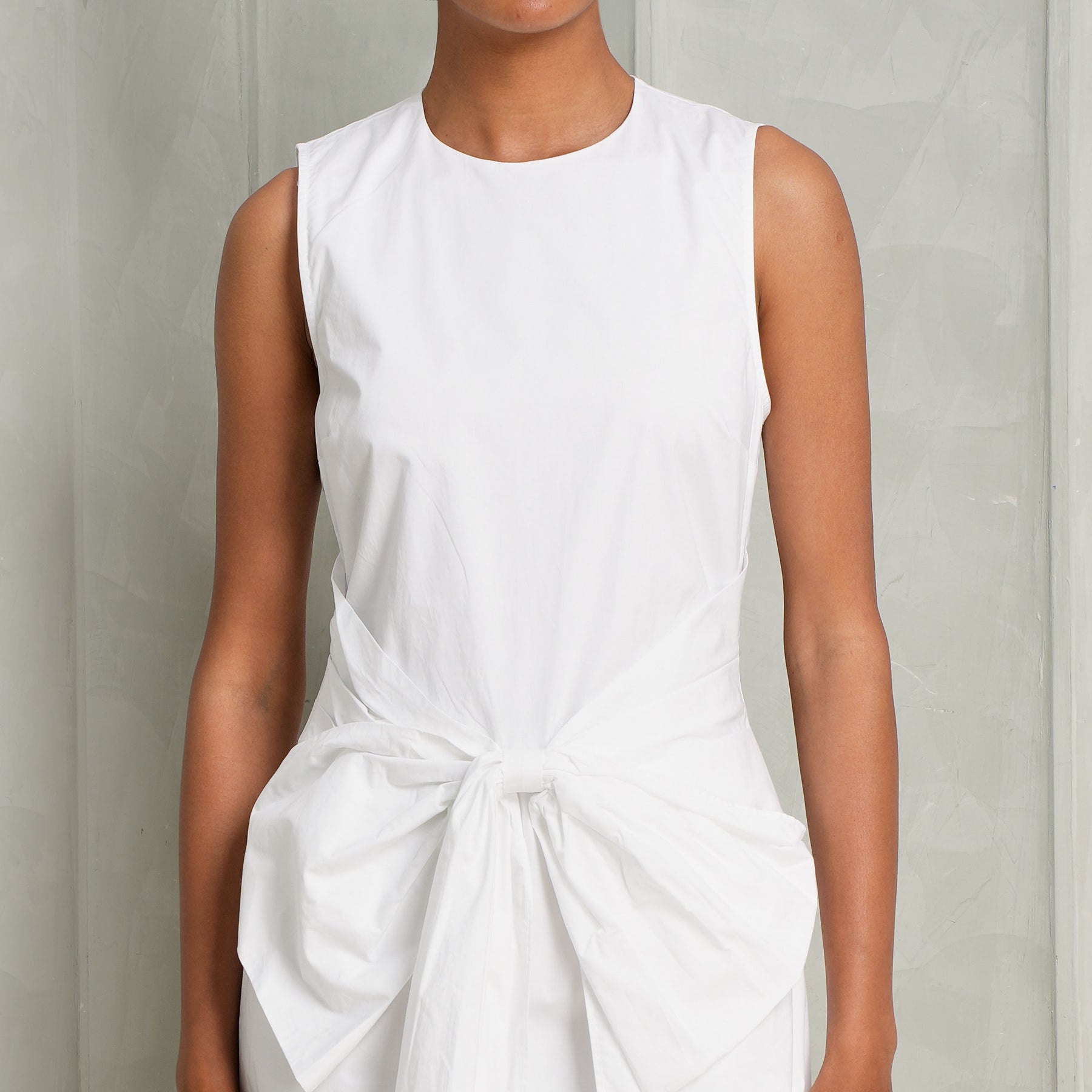 Cut from breathable organic cotton, this Sleeveless Bow Dress from Rotate is defined by clean lines and thoughtful detail. It features a classic round neckline and a streamlined silhouette, secured with a concealed zip at the back for a seamless finish. A softly draped bow at the waist introduces an asymmetric, layered effect across the front, adding movement and subtle dimension. Fully lined for comfort and structure, the dress balances simplicity with quiet statement. Style it with Mini Flamenco Purse from Loewe.
