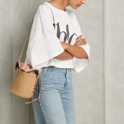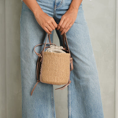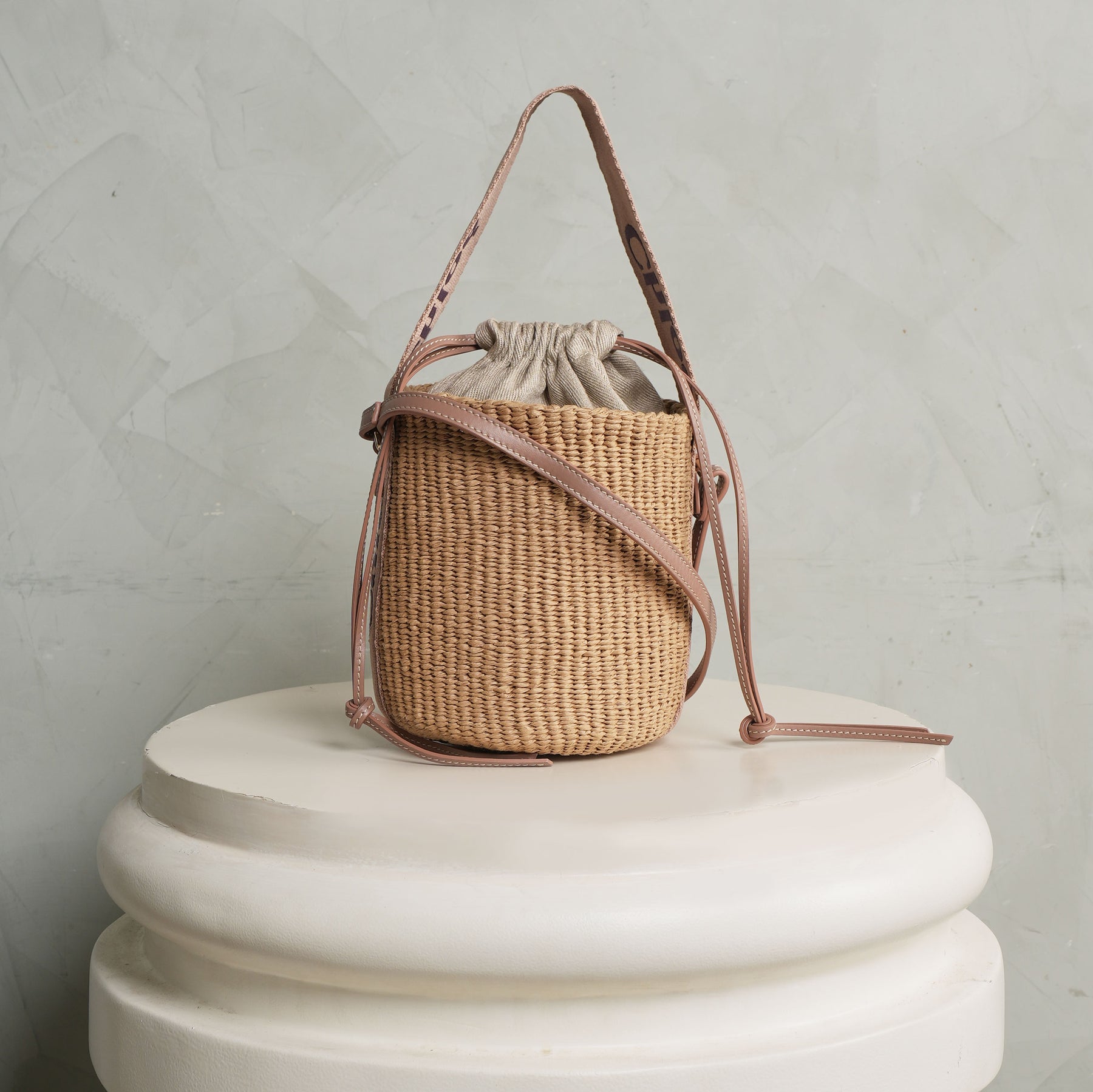 Handcrafted in Kenya from fair-trade paper, the Small Woody Basket from Chloé celebrates traditional weaving techniques and sustainable artistry. The calfskin handle and cotton pouch paired with a leather drawstring adds structure and function to its natural form. This bag features a signed leather tag, honoring the woman who made it. Designed for contemporary versatility, this bag can be styled by hand, on the shoulder, or as a crossbody.