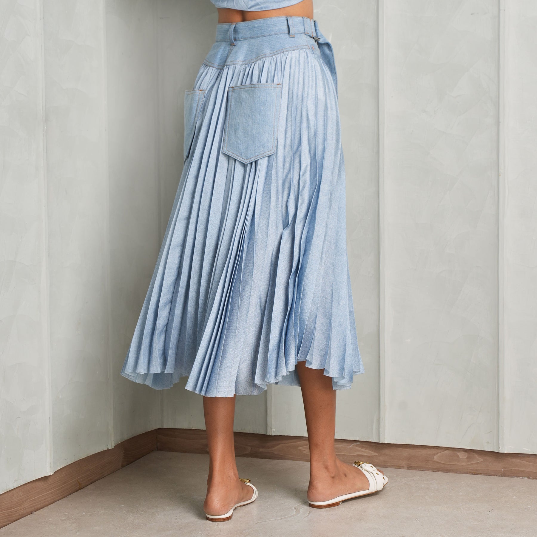 The Sacai Striped Denim Skirt is a modern classic with effortless versatility. It brings a tailored sensibility to everyday dressing. Crafted in striped denim for subtle texture and polish, it sits comfortably on the waist and falls into a clean, relaxed silhouette. Easy to pair and endlessly wearable, it styles well with Hamster flamenco bag from Loewe and Striped Denim shirt from Sacai.