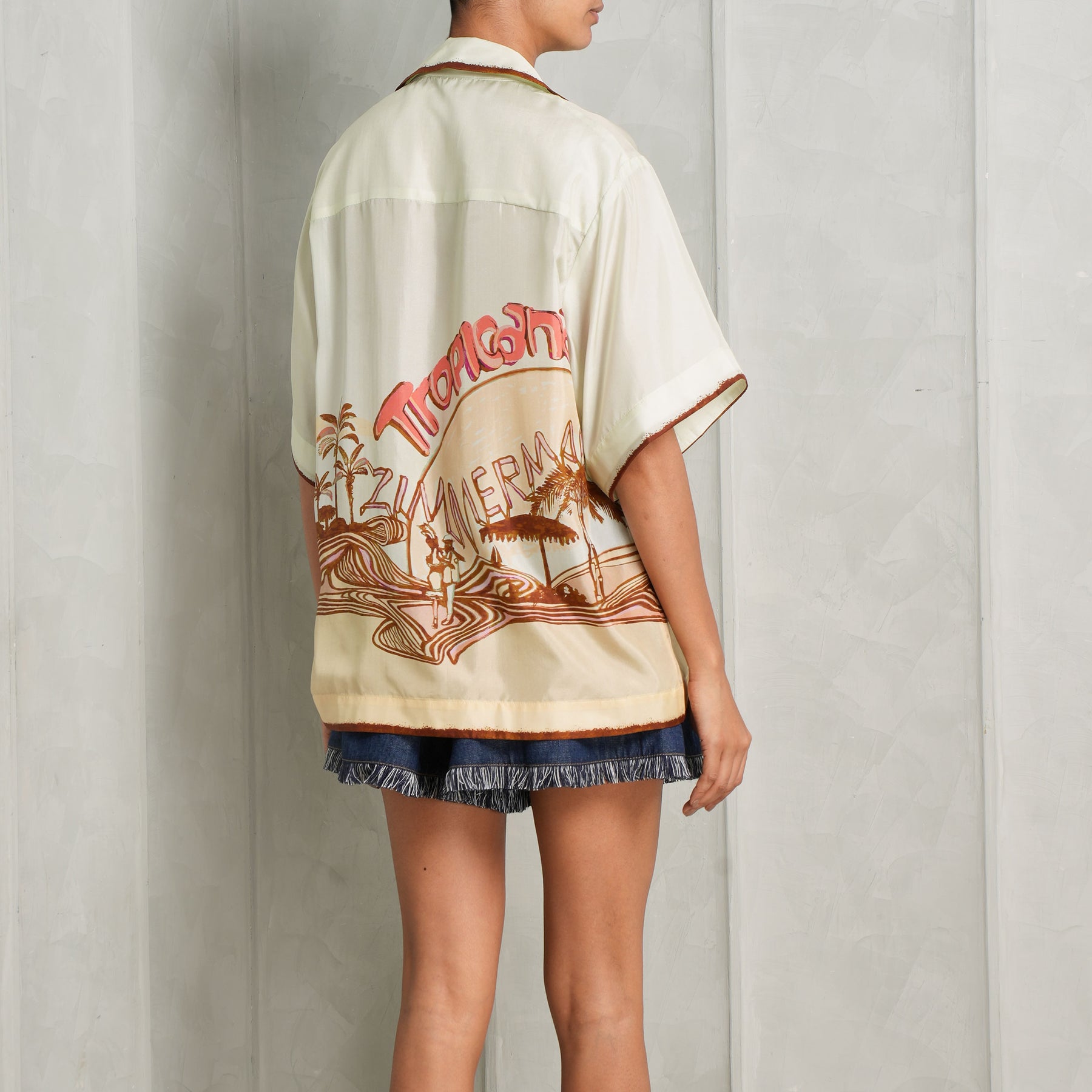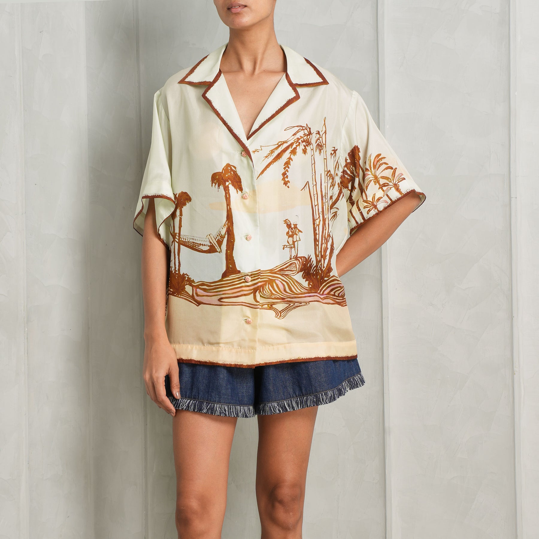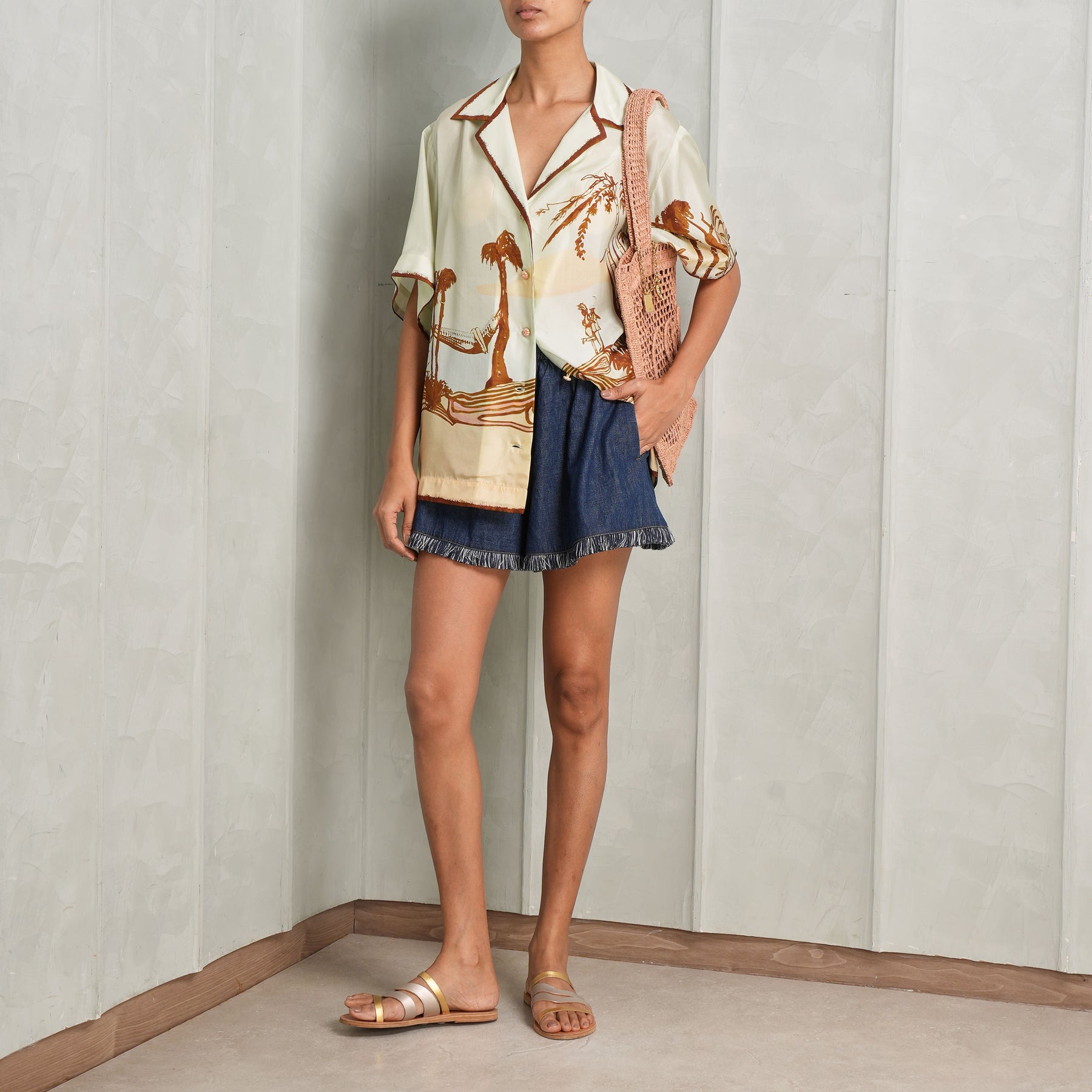 Tropicana Coco Short Sleeve Shirt is a laid-back essential elevated with a fluid, easy drape. Cut in a relaxed silhouette, it showcases a hand-drawn tropical motif framed with contrast piping. Designed with a softly structured collar, short sleeves, and a straight hem, it brings an effortless balance of polish and resort-ready ease. Style it with Rhiannon Fringe Denim Shorts by Zimmermann and Summer Banana Tote Bag from Chloé