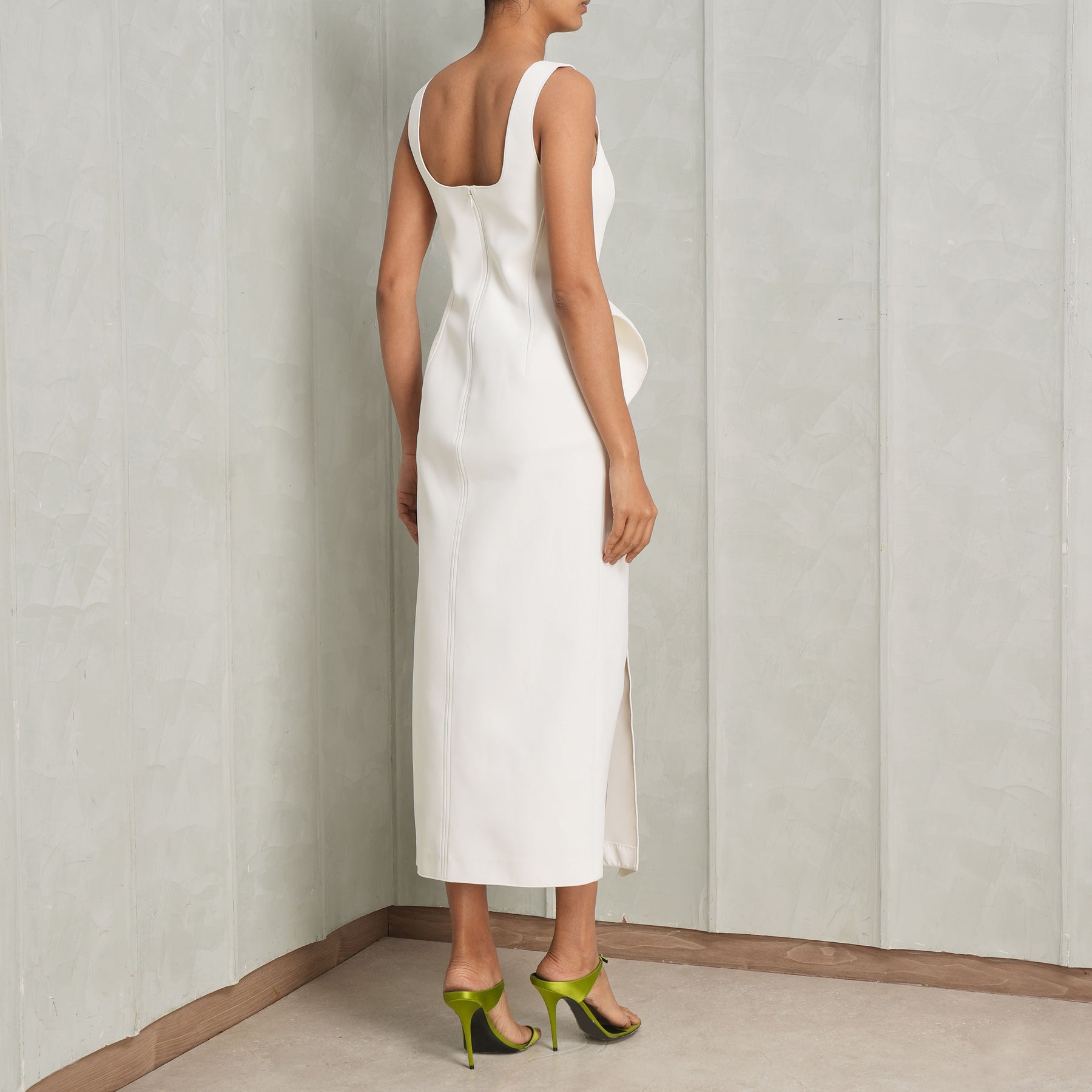 Introducing the Underwood Midi Dress from Acler - clean, sculpted, and undeniably timeless. Crafted from bonded fabric with limited stretch, it holds a defined silhouette, enhanced by a mock-wrap neckline that contours its form. A dramatic cascading frill and a front split add fluid movement, while a side invisible zipper keeps the finish seamless. Style this tailored piece with...