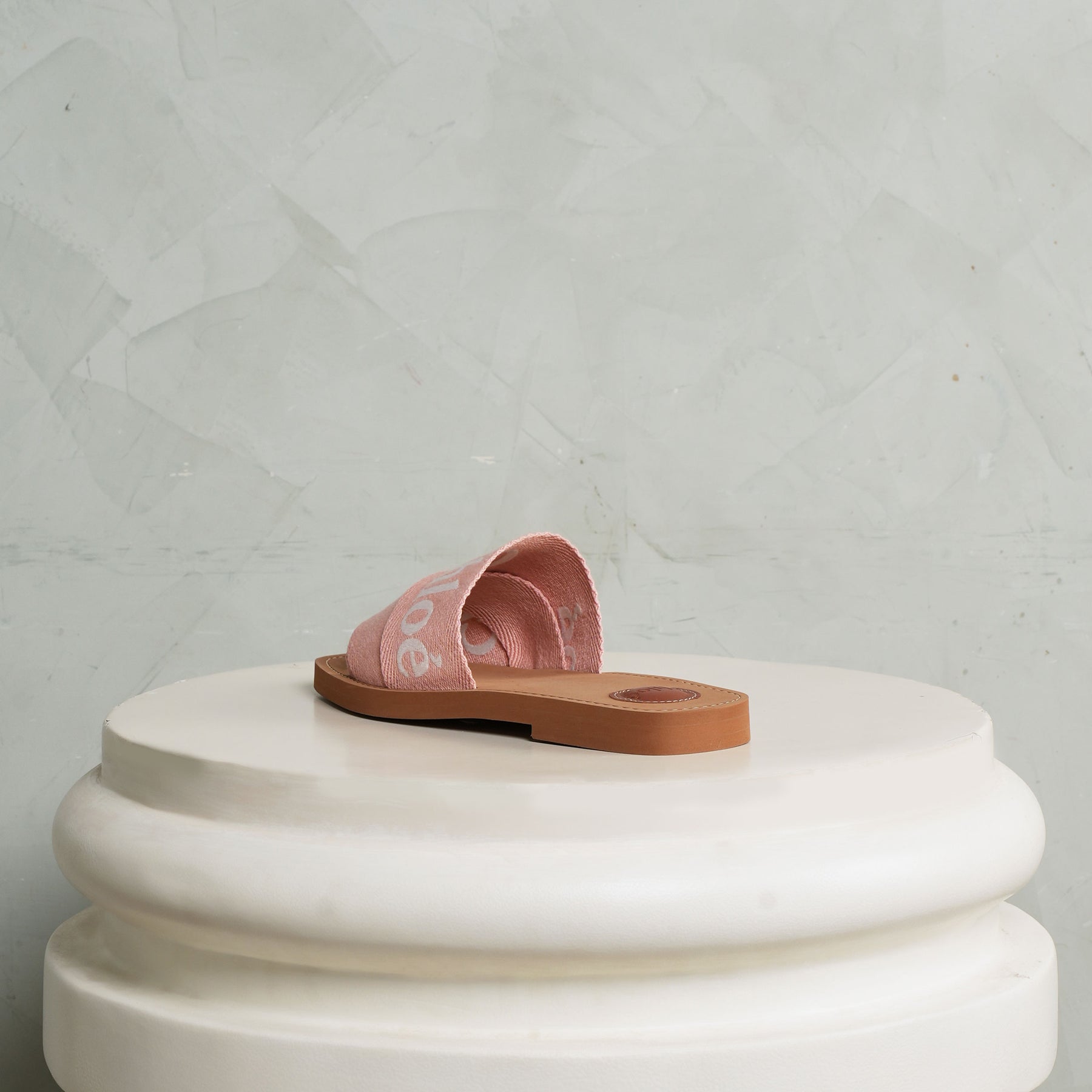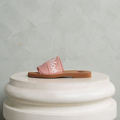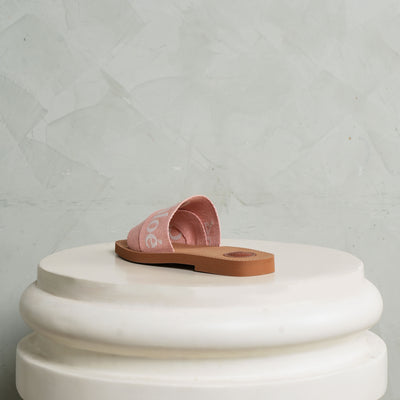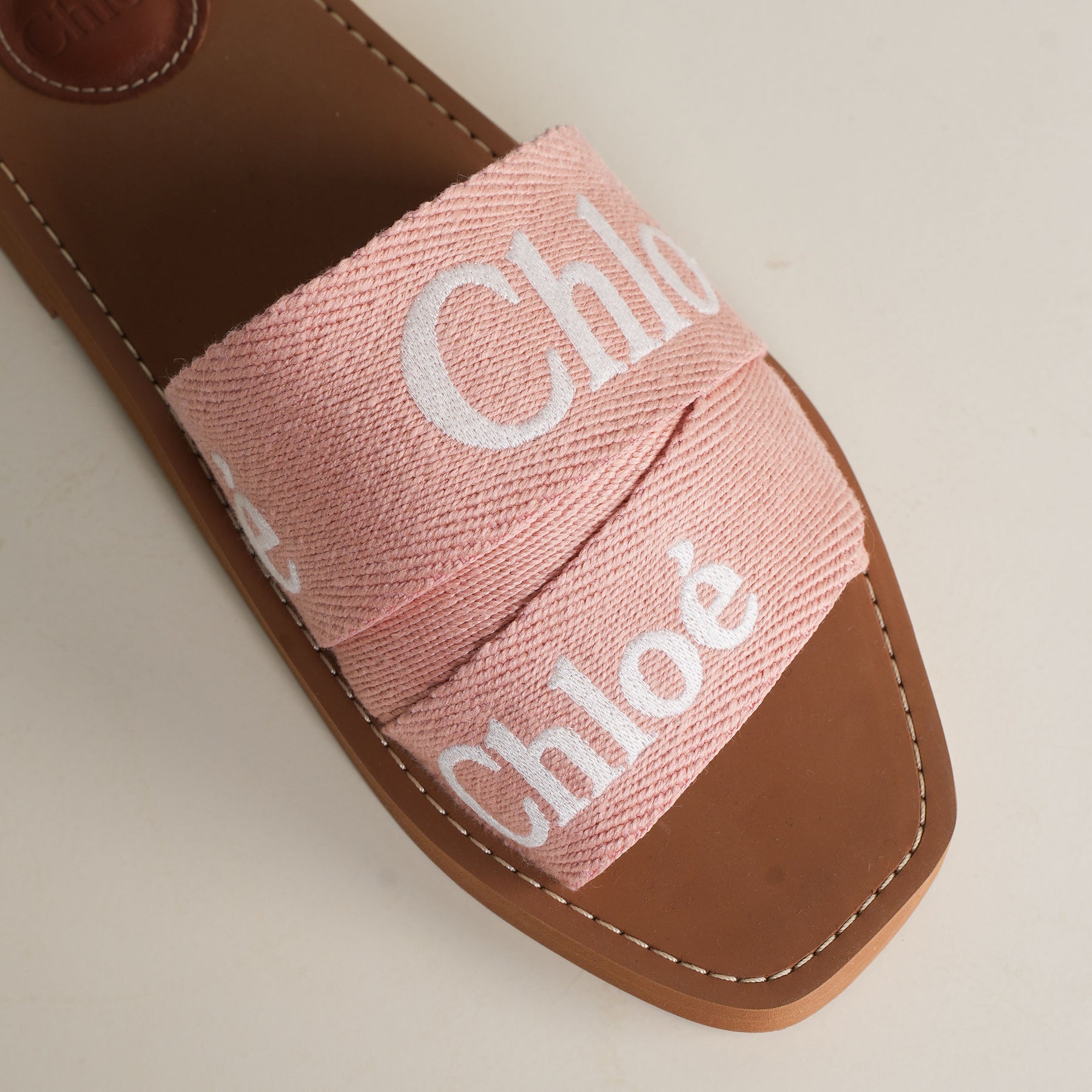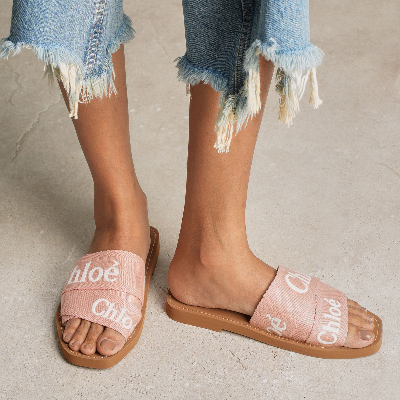 Crafted from eco-conscious linen, the Woody Mule from Chloé boasts a light pink hue, perfect for adding a feminine touch to any ensemble. These mules feature varied ribbons with contrast Chloé logo embroidery. The iconic ecru stitching accents the recycled rubber sole, while the Maison's "O" signature details the inner sole.