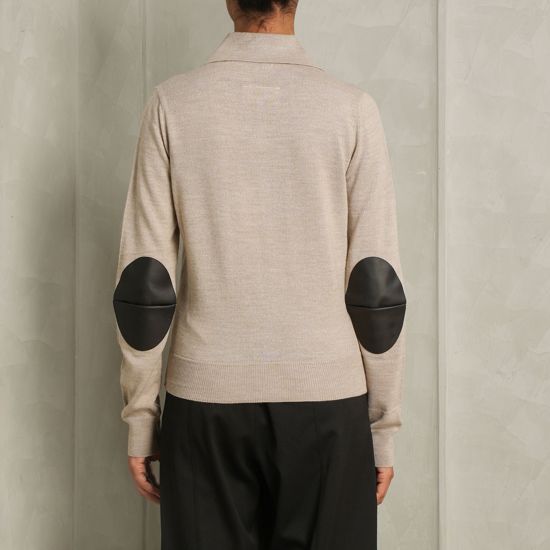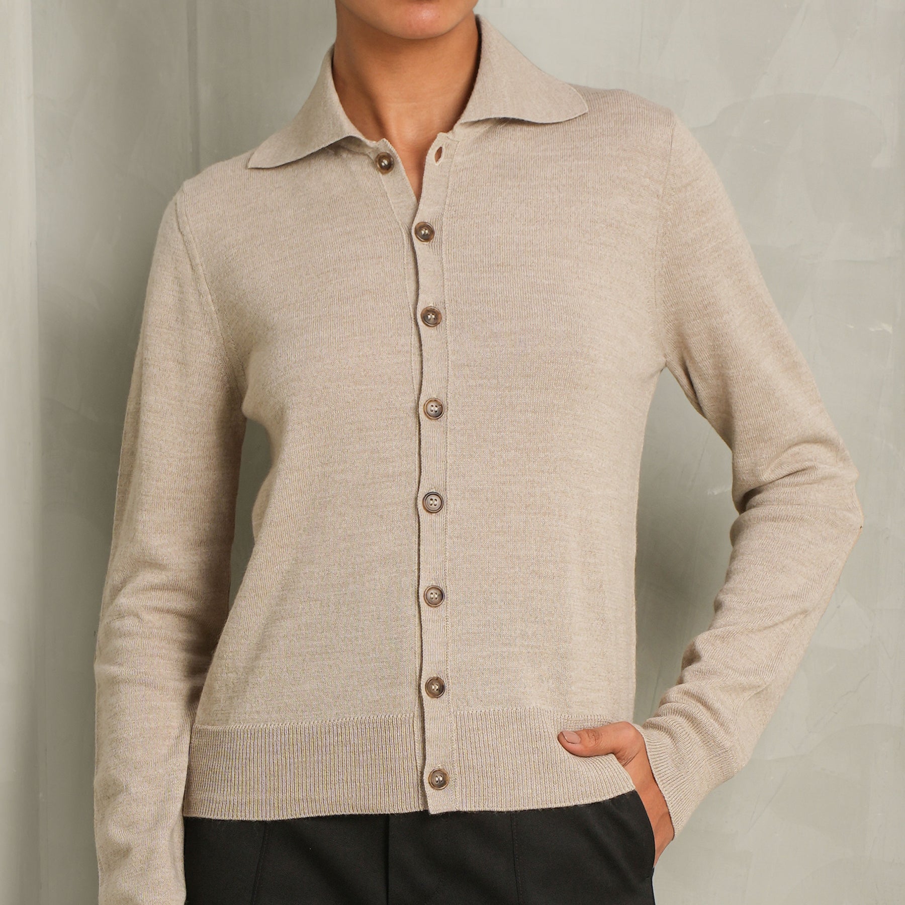 The Wool Cardigan from MM6 Maison Margiela is rendered in beige wool, and offers warmth and understated charm with its classic collar and button down front. The relaxed silhouette and minimalist design make it a versatile layering piece suited for everyday wear. Style this solo or layered with Tailored Wool Trousers and Long Bambino Bag from Jacquemus.